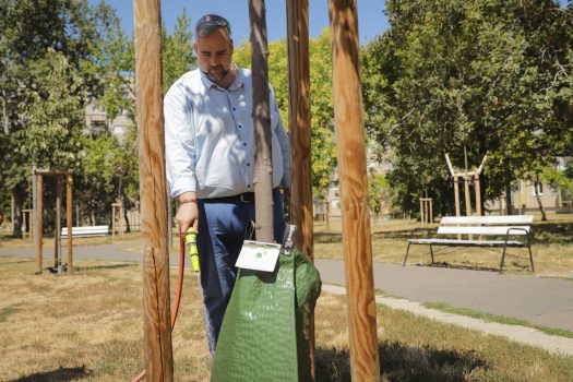 Faöntöző zsákokat telepített önkormányzatunk két parkban is, és továbbiak kihelyezését is tervezi önkormányzatunk. A mostani, aszályos időjárásban a kerület fáinak a szokásos, heti egyszeri öntözése nem elegendő, ezt egészítjük ki locsolózsákok alkalmazásával.